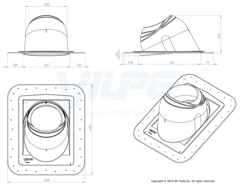 Käyttökohteet: Pyöreiden, metallisten, eristettyjen ulkohalkaisijaltaan 200–265 mm valmispiippujen läpivientiin huopakatteelle. Kattokaltevuus Ø 200 8-50°, Ø 265 8-40°.