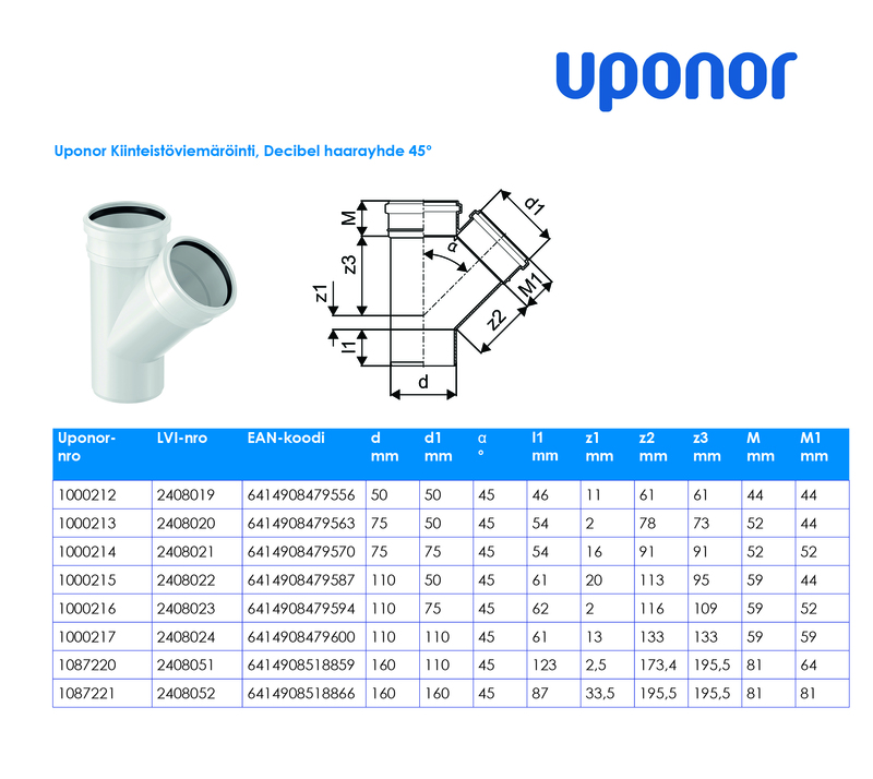 UPONOR DECIBEL Haarayhde dB PP DN 110/75-45°/VALKOINEN 1000216