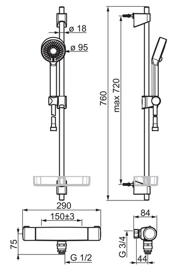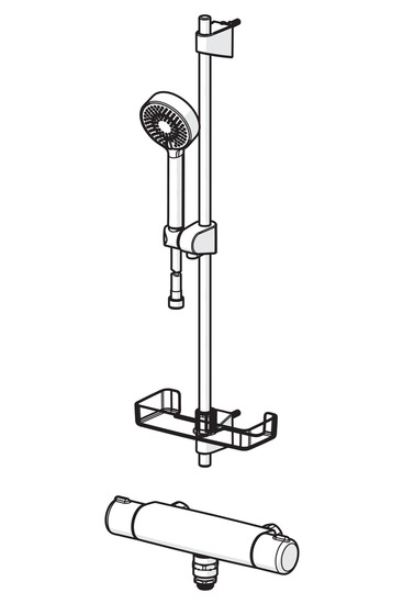 Termostaattinen suihkuhana. Lämmönsäätökahvassa on lämpötilarajoitin, joka voidaan ohittaa nappia painamalla. EcoFlow -virtaamasäädin. Hanassa on tyhjöventtiili, roskasihdit, yksisuuntaventtiilit ja Oras Apollo -suihkusetti 544.