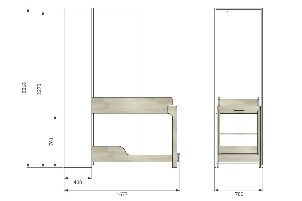 Sängyn nousevat tikkaat muodostavat yläasennossa turvalaidan yläsängyn päätyyn, mikä mahdollistaa kulun alasänkyyn myös päädyn kautta. Sänkyjen mitat ovat 1400x550. Kaappisängyssä on 3 vaakatasossa olevaa askelmaa. Ovi lukittuu suljettaessa automaattisesti siten, että lapset eivät pysty avaamaan sitä. Kolkutuksenestolaite kiinnittää oven automaattisesti sängyn laitaan. Lukitushaka lukitsee sängyt automaattisesti yläasentoon. Lisävarusteena on saatavissa pimentävä verho alasänkyyn. Kaapin saranat avautuvat 250 astetta. Kaappi on varustettu säätöjaloilla. Sängyissä kiinteät turvalaidat.