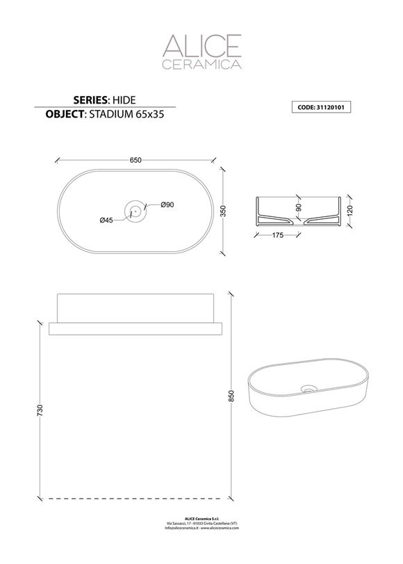 Alice Ceramica HIDE malja-allas 65x35x12 cm kiiltävä valkoinen posliini ilman hanareikää ilman ylivuotoaukkoa |