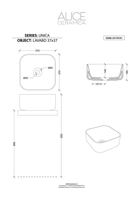Alice Ceramica UNICA malja-allas 37x37x17 cm mattamusta posliini ilman hanareikää ilman ylivuotoaukkoa |