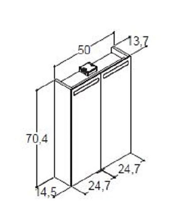 Dansani Mido -sarjan 50 cm leveä valaisinpeilikaappi 2:lla ovella, väriltään mattavalkoinen. Valaisinpeilikaappi sisältää vetimet. Tuotteessa on päävalaistus. Tuotteessa on siirrettävä pistorasia.