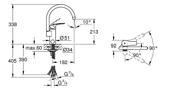 Grohe Eurosmart -keittiöhana on kestävällä ja kiiltävällä StarLight-kromipinnoitteella. Sen korkea, kääntyvä juoksuputki tarjoaa joustavuutta, ja sen kääntyvyyttä voi rajoittaa 0°, 150° ja 360° asteeseen. Integroitu pesukoneventtiili lisää käytännöllisyyttä. Keraaminen säätöosa takaa tarkan veden virtauksen ja lämpötilan säädön ilman nykimistä. Pika-asennusjärjestelmä ja joustavat liitosletkut tekevät asennuksesta vaivatonta ja nopeaa.